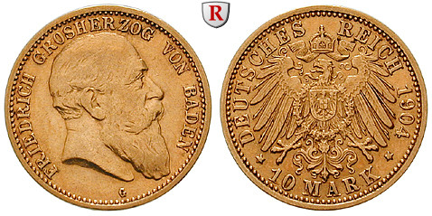 Friedrich I. 1852-1907. 10 Mark 1904 G. J. 190; GOLD, sehr schön +