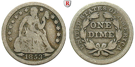 Dime 1853. Seated Liberty. Arrows. nearly very fine