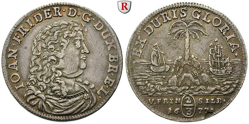 Johann Friedrich 1665-1679. 2/3 Taler 1677 Hannover. Palmbaumgulden. Dav. 377; sehr schön +