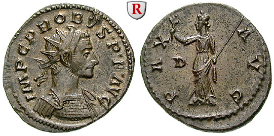 Zur Münzgeschichte: Trotz der wirtschaftlichen Erholung des Reiches - unter Probus gab es wieder Goldmünzen - blieb das beherrschende Münznominal der Antoninian mit seiner dünnen Silberauflage (Sudverfahren). Die Beizeichen auf den Prägungen (Buchstaben und Zahlen) nahmen zur Kontrolle der einzelnen Münzausgaben weiter zu und bildeten eine Vorstufe des ausgebauten Systems unter der Tetrarchie.