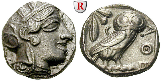 Tetradrachm 24 mm 2. Hälfte 5.cent. BC. Head of Athena with Attic helmet right / Owl standing right, head facing, olive sprig and crescent behind. Svoronos Taf. 11ff.; very fine to extremely fine, small flan