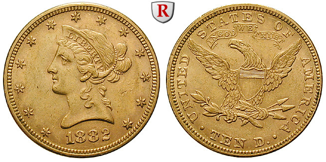 10 Dollars 15,05 g fein, 1882 Philadelphia. Liberty. Friedb. 158; GOLD, fast vorzüglich, Kratzer