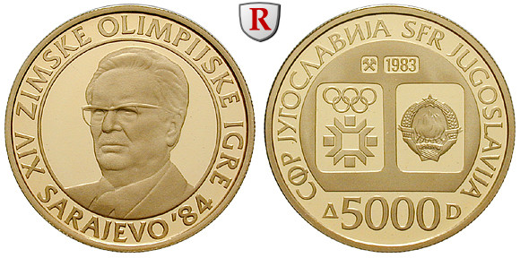 Republik 1945-1992. 5000 Dinara 7,2 g fein, 1983. Olympische Spiele Sarajevo 1984 - Tito. Friedb. 15; GOLD, Polierte Platte, mit Zertifikat