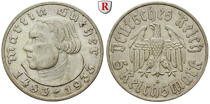 5 Reichsmark 1933 A. Luther. J. 353; fast vorzüglich, Vs. l. geputzt