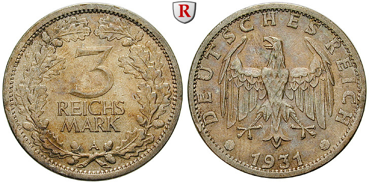 3 Reichsmark 1931 A. J. 349; good very fine, edge knocks