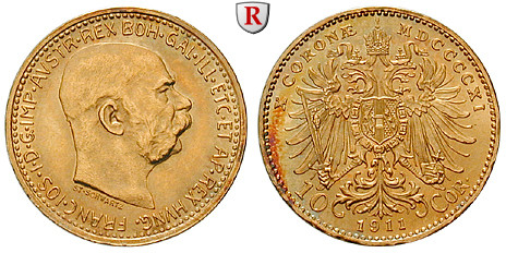 Franz Joseph I. 1848-1916. 10 Kronen 3,05 g fein, 1911. Typ Schwartz. Friedb. 513; GOLD, vorzüglich +
