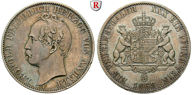 Leopold Friedrich 1817-1871. Vereinstaler 1869 A. AKS 30; sehr schön +, l. Korrosion auf Vs.