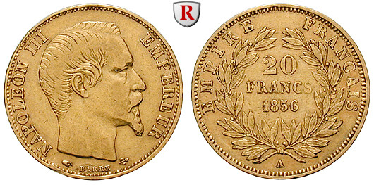 Napoleon III 1852-1870. 20 Francs 5.81 g fine, 1856 A. Bare head. Friedb. 573; GOLD, very fine, current price