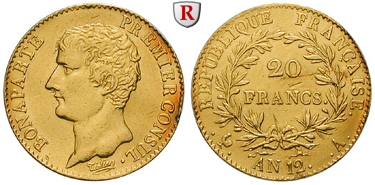Napoleon I. (Kaiser) 1804-1815. 20 Francs 5,81 g fein, 1803-1804 (AN 12) A. Barhäuptiger Kopf. Friedb. 487; GOLD, sehr schön, Fassungsspuren
