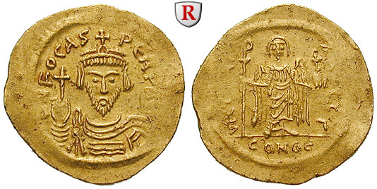 Phocas 602-610. Solidus 22 mm 602-610 Constantinopel. Büste mit Krone und Kreuzglobus von vorn / Engel hält Stab mit Christogramm und Kreuzglobus, Offizin G. Sear 620; GOLD, sehr schön +