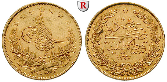 Abdul Aziz 1861-1876. 100 Piaster 6.62 g fine, 1867 Konstantinopel. Schl. 387; GOLD, very fine to extremely fine