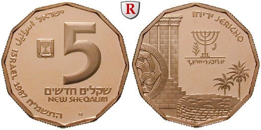 5 Neue Shekalim 7,77 g fein, 1987. Ruinen von Jericho. Friedb. 29; GOLD, Polierte Platte