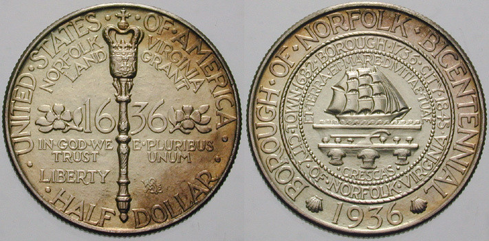 1/2 Dollar 1936. Norfolk, Virginia, Bicentennial. Schön 75; fast stempelfrisch, Leichte Patina