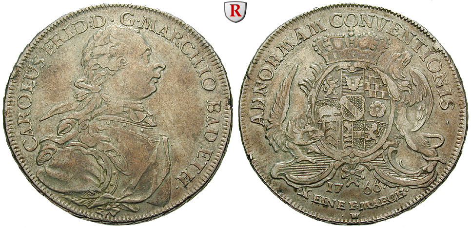 Karl Friedrich 1746-1806. Konventionstaler 40 mm 1766 Durlach. Dav. 1933; very fine