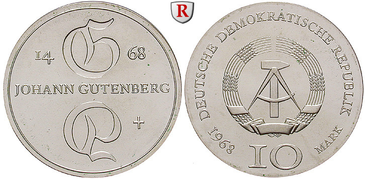 10 Mark 1968. Gutenberg. J. 1523; stempelfrisch