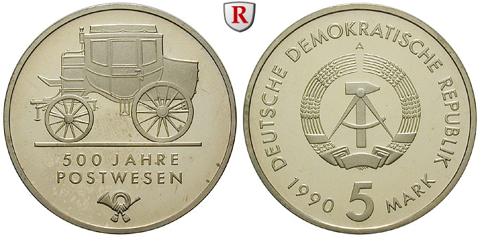 Kupfer-Nickel-5 Mark 1990. 500 Jahre Postwesen. J. 1631; Polierte Platte