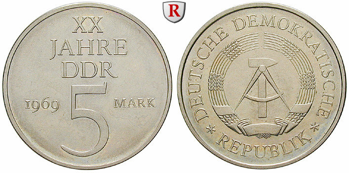 Kupfer-Nickel-5 Mark 1969. 20 Jahre DDR, Materialprobe. J. 1524 P1; stempelfrisch