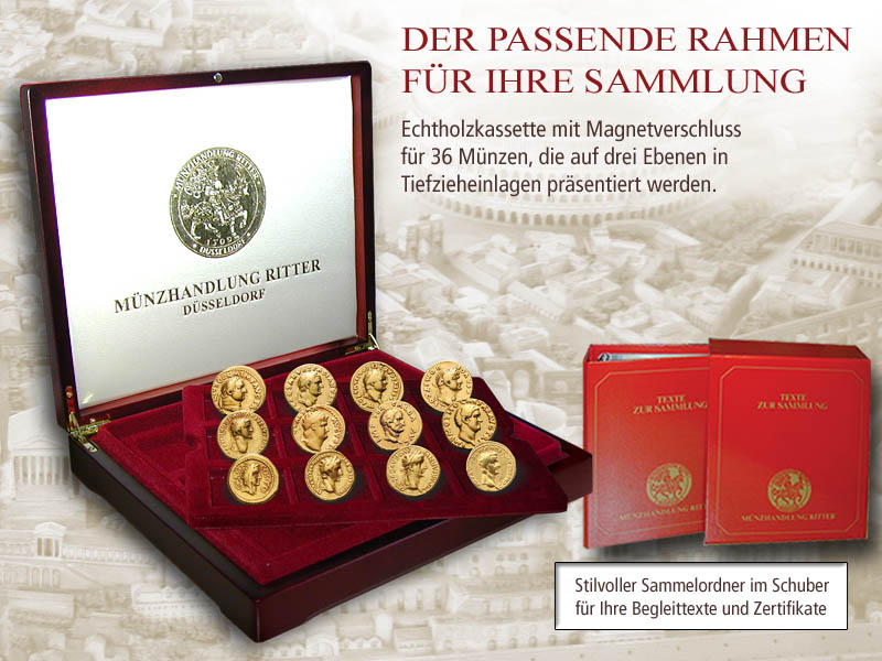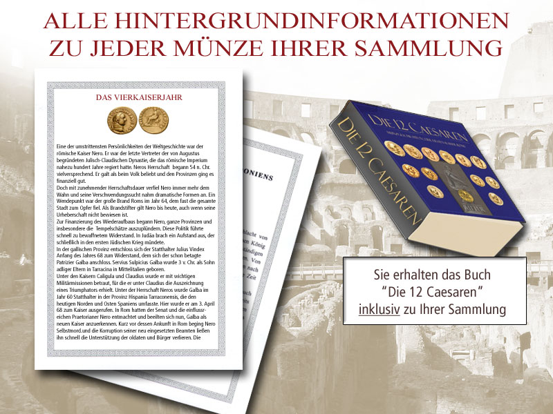Extraleistungen inklusive: Jede Münze wird von einem Foto-Echtheitszertifikat, einem Herrschertext sowie einem ausführlichen numismatischen und historischen Hintergrundtext begleitet. Passend hierzu erhalten Sie einen stabilen Sammelordner zur Ablage der Texte und Zertifikate.