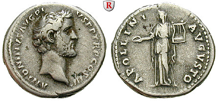 Antoninus Pius 138-161. Denarius 17 mm 140-143 Rome. Laureate head right ANTONINVS AVG PIVS PP TR P COS III / APOLLINI AVGVSTO Apollo standing left, holding patera and lyre. RIC 63; good very fine
