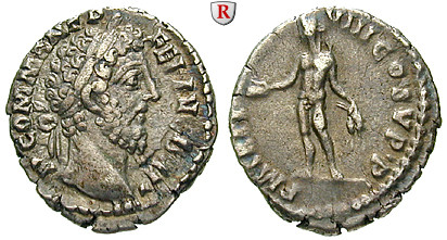 Commodus 177-192. Denarius 18 mm 188 Rome. Laureate head right M COMM ANT P FEL AVG BRIT / PM TR P XIII IMP VIII COS V PP Genius standing left, holding patera and corn-ears. RIC 167; good very fine