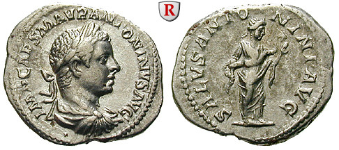 Elagabalus 218-222. Denarius 20 mm 218-219 Rome. Laureate, draped and cuirassed bust right IMP CAES M AVR ANTONINVS AVG / SALVS ANTONINI AVG Salus standing right with patera, feeding snake. RIC 140; nearly extremely fine