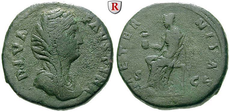 Faustina I., Frau des Antoninus Pius +141. Messing-Sesterz 32 mm nach 141 Rom. Verschleierte Büste r. mit Diadem DIVA FAVSTINA / AETERNITAS SC Thronende Aeternitas l., hält Zepter und Phönix auf Globus. RIC 1103b; sehr schön +, grüne Patina