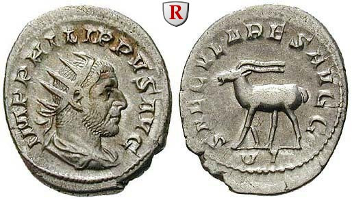 Philippus I 244-249. Billon-Antoninianus 25 mm Rome. Radiate, draped and cuirassed bust right IMP PHILIPPVS AVG / SAECVLARES AVG Antilope standing left; mintmark VI. RIC 21; very fine to extremely fine