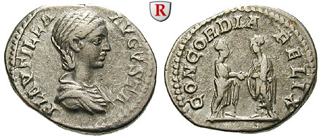 Plautilla, wife of Caracalla +211. Denarius 19 mm 202 Rome. Draped bust right PLAVTILLA AVGVSTA / CONCORDIA FELIX Caracalla dn Plautilla clasping hands. RIC 365a; very fine to extremely fine