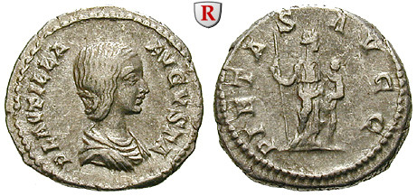 Plautilla, wife of Caracalla +211. Denarius 19 mm 203 Rome. Draped bust right PLAVTILLA AVGVSTA / PIETAS AVGG Pietas standing right, holding infant and scepter. RIC 367; very fine to extremely fine