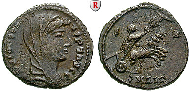 Alleinherrscher des römischen Reiches. Förderer des Christentums, geehrt als der Große. Als sein Vater Constantius Chlorus, Caesar in der 1.Tetrarchie unter Diocletianus und Maximianus Herculius, Theodora, die Stieftochter des Maximianus Herculius, heiratete, begab sich der unehelich geborene CONSTANTINUS nach einem Aufenthalt in Gallien an den Hof des Diocletianus in Nicomedia (Kleinasien in der heutigen Türkei). Nach der Abdankung des Diocletianus im Jahre 305 kehrte Constantinus zu seinem Vater nach Gallien und Britannien zurück und wurde nach dessen Tod (306) von den Truppen dort zum neuen Augustus ausgerufen. Er fand keine Zustimmung des Augustus Galerius, der Severus II. zu seinem Mitaugustus machte und Constantinus nur als Caesar akzeptierte. Erst im Jahre 310 war Constantinus allgemein anerkannter Mitkaiser neben Galerius Maximianus, Maximinus Daia und Licinius I. (4 Augusti) und dem umstrittenen Augustus Maxentius in Rom.