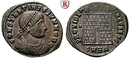 Zur Münzgeschichte: Die meisten erhaltenen Prägungen dieses Herrschers stammen aus seiner Regierungszeit als Caesar unter seinem Vater (317-337). Es sind vor allem Bronzemünzen, die in dieser Zeit immer kleiner werden (Inflation) und die in allen Reichsmünzstätten geprägt wurden. Die Münzen seiner Augustuszeit (337-340) sind seltener. Obwohl die Portraits flach geschnitten sind, treten die Züge auf gut erhaltenen Stücken scharf und individuell hervor.