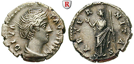 Zur Münzgeschichte: Die meisten erhaltenen Münzen sind in Rom geprägt, und zwar posthum (= nach ihrem Tode). Daher ist es nicht verwunderlich, daß sie auf den Münzabbildungen etwas matronenhaft wirkt. Es handelt sich dabei eben um eine altersgemäße Anpassung an den über 20 Jahre älteren Gemahl Antoninus Pius. Besonders der Münztyp mit der unverschleierten Büste zeigt ihre Frisur deutlich. Sie hat ihr an Stirn und Schläfen gelocktes Haar am Hinterkopf hochgesteckt und mit Perlenketten sowie einem dreifachen Perlenring, einer Art Krone, befestigt. Damit soll ihr Portrait Schönheit und Würde ausdrücken, keinesfalls aber Jugend oder ihr wahres Alter.